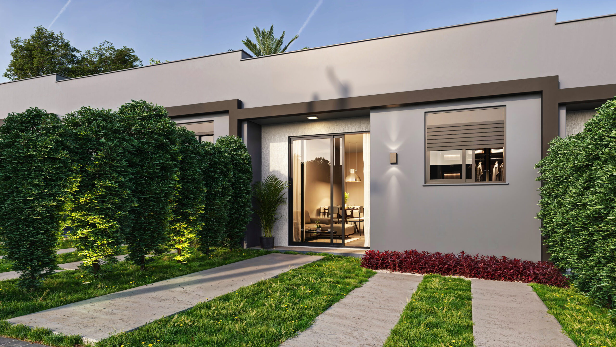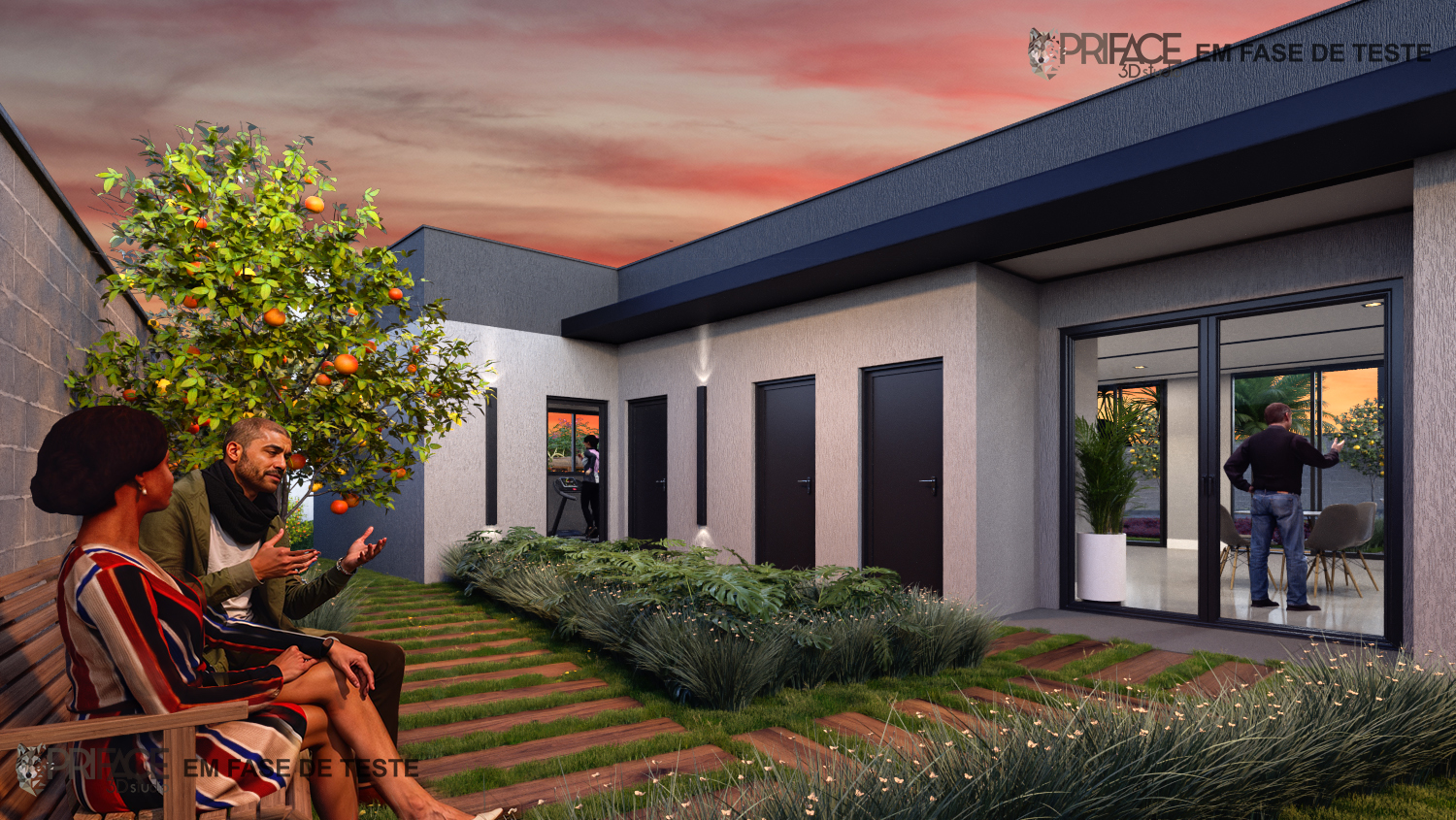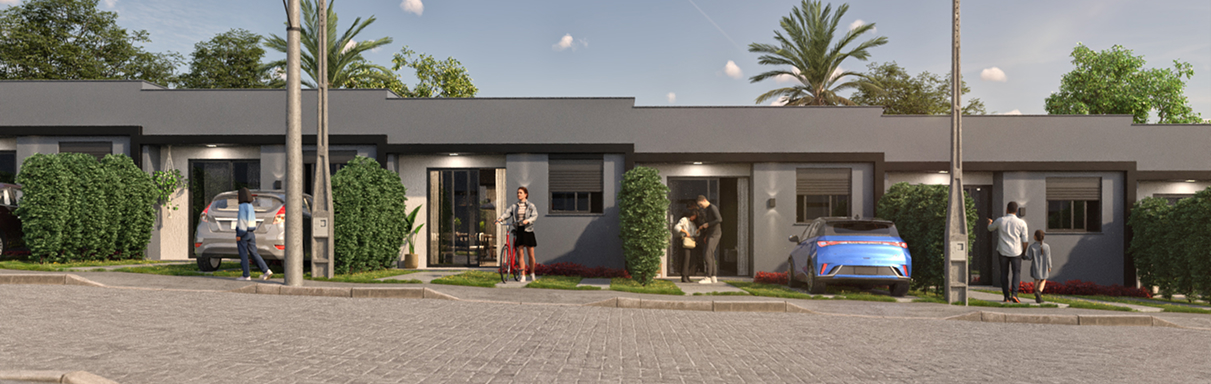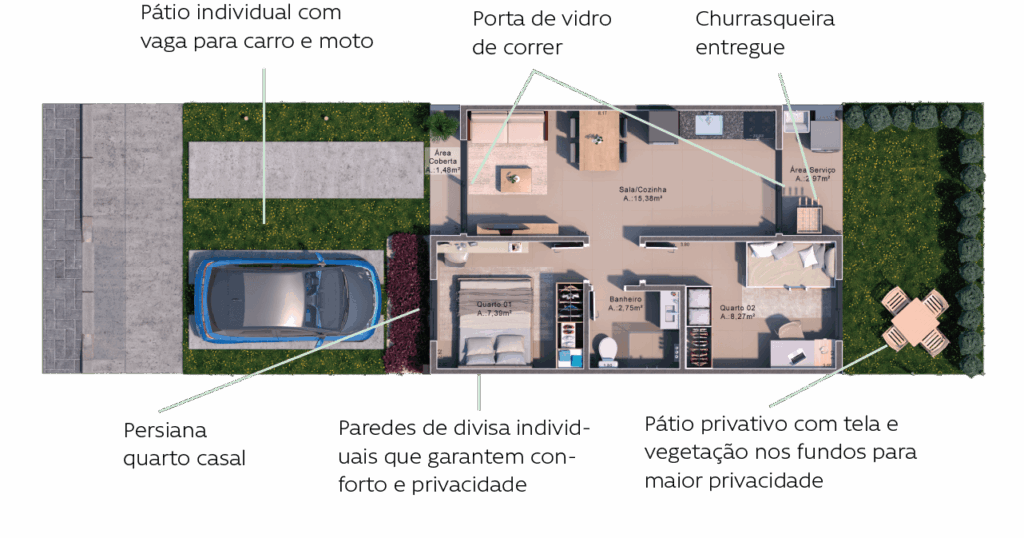 Cozinha/sala: 15,38m² Quarto 1: 7,30m² Quarto 2: 8,27m² Banheiro: 2,75m² Área de serviço: 2,97m² Pátio frontal: 26,33m² Pátio privativo de fundos: 15,26m² *unidade padrão
